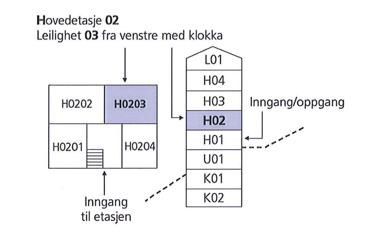 Har du bolignummer H0203, forteller det at leiligheten din ligger i andre hovedetasje og at den er nummer tre fra venstre. Les mere om bolignummeret hos Kartverket.